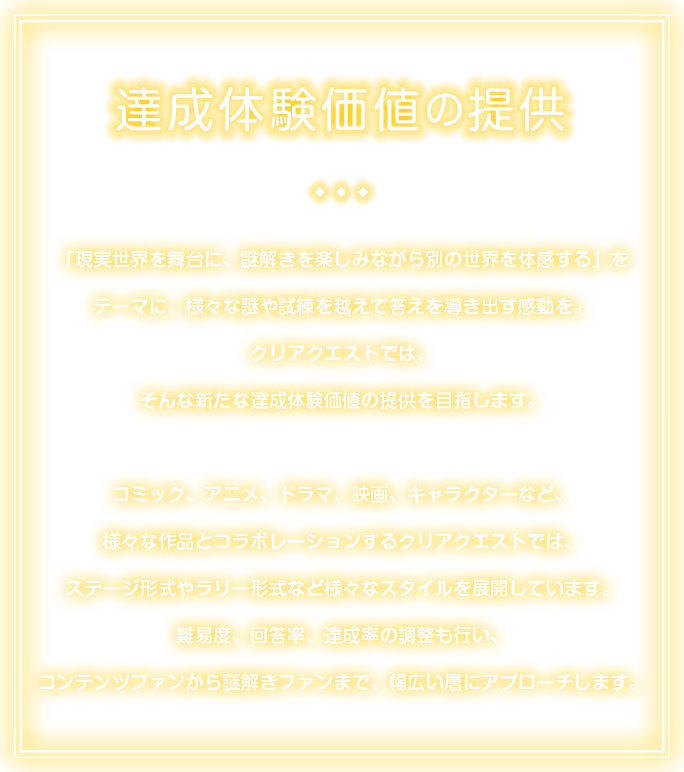 「現実世界を舞台に、謎解きを楽しみながら別の世界を体感する」をテーマに、様々な謎や試練を越えて答えを導き出す感動を。